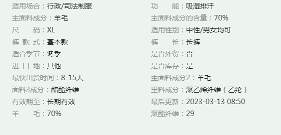 水政監(jiān)察服裝 冬常服面料(藍(lán)青色) 成分:羊毛:70%、聚酯纖維:30%、 平方米質(zhì)量:210g/㎡ 密度:經(jīng):492根/10cm、緯:356根/10cm 面料、翻領(lǐng)面、領(lǐng)座面、掛面、大袋牙、袋蓋、手巾袋墊布、褲后袋口墊布、肩袢、褲門襟、掩襟、褲袢 里料(聚酯纖維) 成份:聚酯纖維:99% 超細(xì)纖維另一種合成材料,