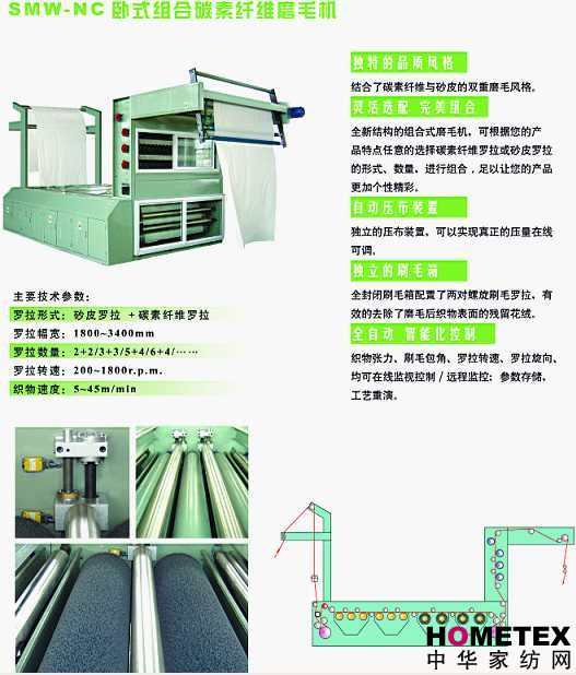 根據(jù)砂皮與碳素(陶瓷)纖維羅拉搭配的目數(shù)及工藝的調整??蓪崿F(xiàn)棉、滌、化纖等梭織物的中、長、短毛磨毛整理。是具有砂皮和碳素(陶瓷)纖維兩種風種的產(chǎn)物,風格別具一格。