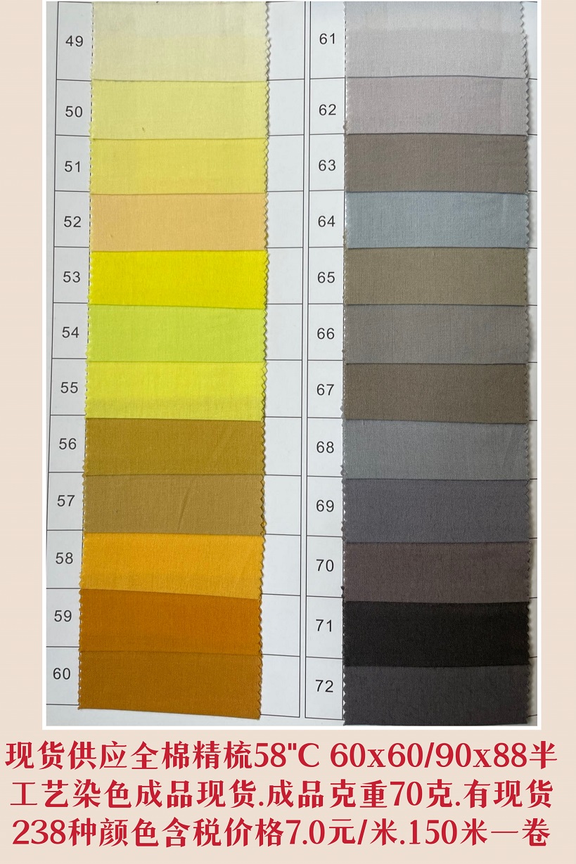 倉庫常年現(xiàn)貨供應(yīng)60"JC60x60/90x88染色成品布有238種顏色細(xì)布,