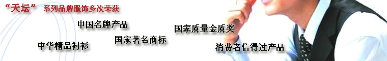 公司的“天壇”品牌商標(biāo)注冊于1955年,先后獲得“國家質(zhì)量金質(zhì)獎”、“國家著名商標(biāo)”、“中國十大名牌服裝”、“中華精品襯衫”、“北京市名牌產(chǎn)品”、“北京市優(yōu)質(zhì)產(chǎn)品”、“北京市好產(chǎn)品”、“北京市拳頭產(chǎn)品”、“消費(fèi)者信得過產(chǎn)品”等百余項(xiàng)榮譽(yù),在全國性七次襯衫評比中,七次奪魁。2001年“天壇”品牌又榮獲中國名牌戰(zhàn)略推進(jìn)委員會授予的首批“中國名牌產(chǎn)品”稱號。許多國家領(lǐng)導(dǎo)人及知名人士在公司設(shè)計訂做服裝,影響巨大。