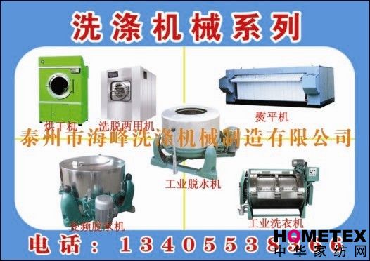 泰州海鋒機(jī)械制造有限公司.海鋒牌洗滌機(jī)械,全國(guó)排名第三 地處江蘇省泰州市高新技術(shù)開發(fā)區(qū);注冊(cè)資本1000萬元;占地面積106畝,廠房面積21000平方米。